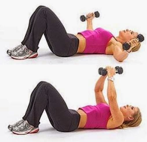 Siapkan 2 buah dumbel dengan berat 1-2 kg. Berbaringlah di lantai sambil menekuk lutut hingga telapak kaki menempel di lantai. Kemudian luruskan tangan ke samping kanan dan kiri, dan angkat dumbel lurus ke atas dada. Tahan beberapa detik, dan kembalikan ke posisi semula. Lakukan gerakan ini sebanyak 15 kali dalam sehari untuk meningkatkan kualitas otot dada.